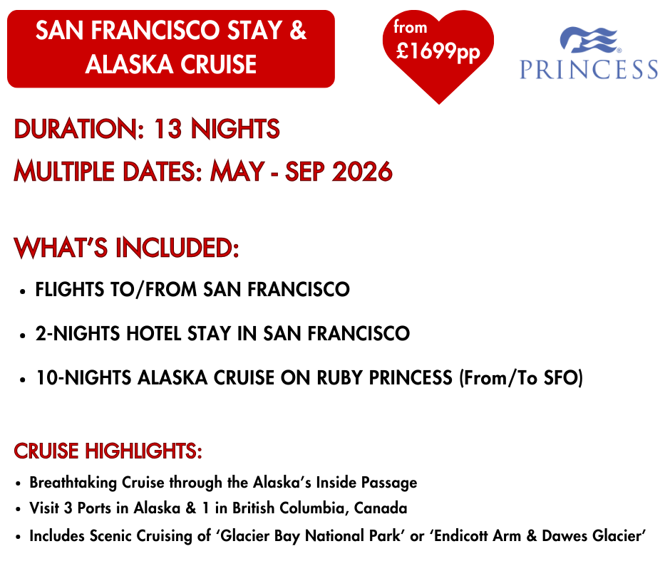 Ports of call:Fly to San Francisco for 2 nights hotel stay, Embark Ruby Princess in San Francisco and cruise to, Ketchikan - Alaska, Glacier Bay National Park (Scenic Cruising), Skagway - Alaska, Sitka - Alaska, Prince Rupert - British Columbia - Canada, Debark in San Francisco for overnight flight back home,